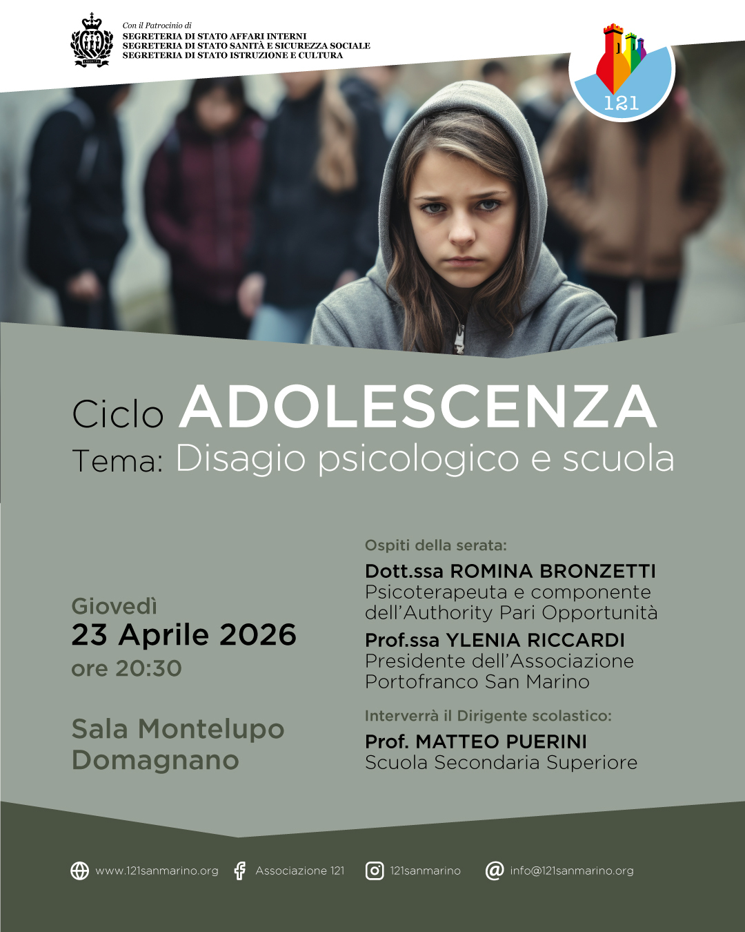Giovedì 23 aprile 2026 alle ore 20:30, presso la Sala Montelupo di Domagnano, l'Associazione 121 organizza il primo appuntamento del ciclo di incontri dedicati al benessere dei giovani. Il tema della serata sarà "Disagio psicologico e scuola": un'occasione di riflessione e confronto aperta a tutta la comunità.
