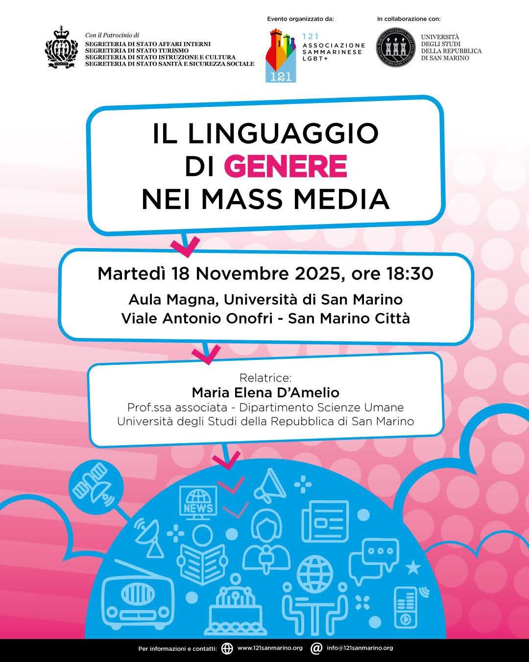L’Associazione 121, in collaborazione con l’Università degli Studi della Repubblica di San Marino, organizza l’incontro pubblico “Il linguaggio di genere nei mass media” che si terrà martedì 18 novembre 2025 alle ore 18:30 presso l’Aula Magna dell’Università di San Marino (Viale Antonio Onofri).