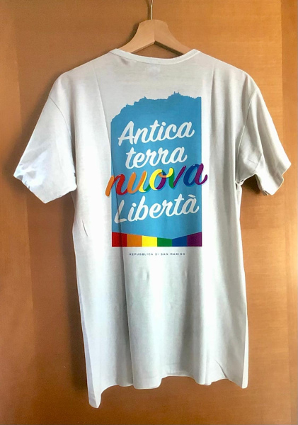 T-shirt bianca in cotone con logo 121 e "Antica terra, nuova libertà"