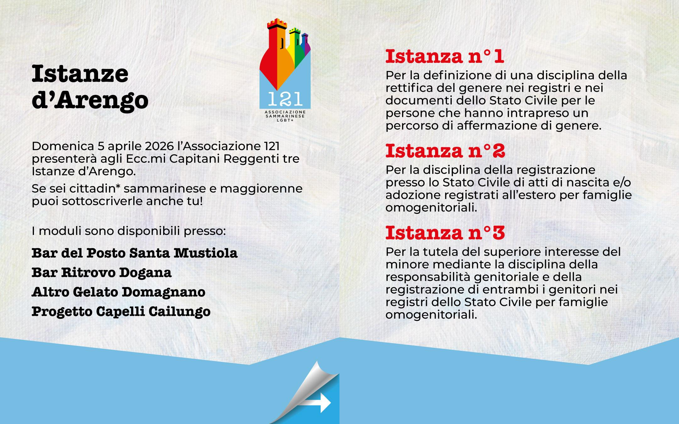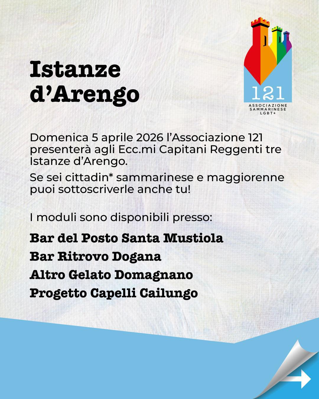 Associazione 121 will present three Arengo Istanze (Petitions) to Their Excellencies the Captains Regent that speak clearly: it is time to recognise rights that are still denied today.